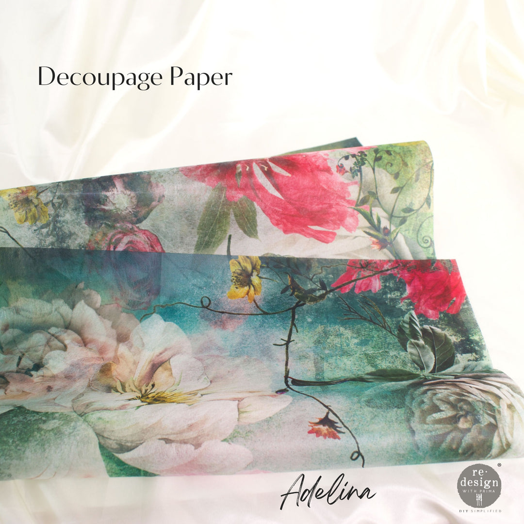 Our new Decoupage Paper designs are truly a work of art! With a beautiful, ethereal effect, Adelina is filled with lush florals in bright pinks, deep yellows, soft whites, peaches, and more, all on a dreamy watercolor backdrop.