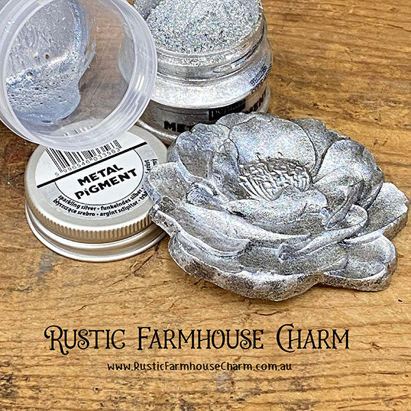 Given that they are not stable in aqueous solutions, they can be mixed into resins, water- or solvent-based varnish, or sprinkled onto sticky surfaces in mixed media or scrapbooking projects. For immediate use, mix the powder with Pentart's Pigment Fix until the desired consistency is reached, then apply the mixture to the surface. The surface will shine very nicely, looking like a real metal.