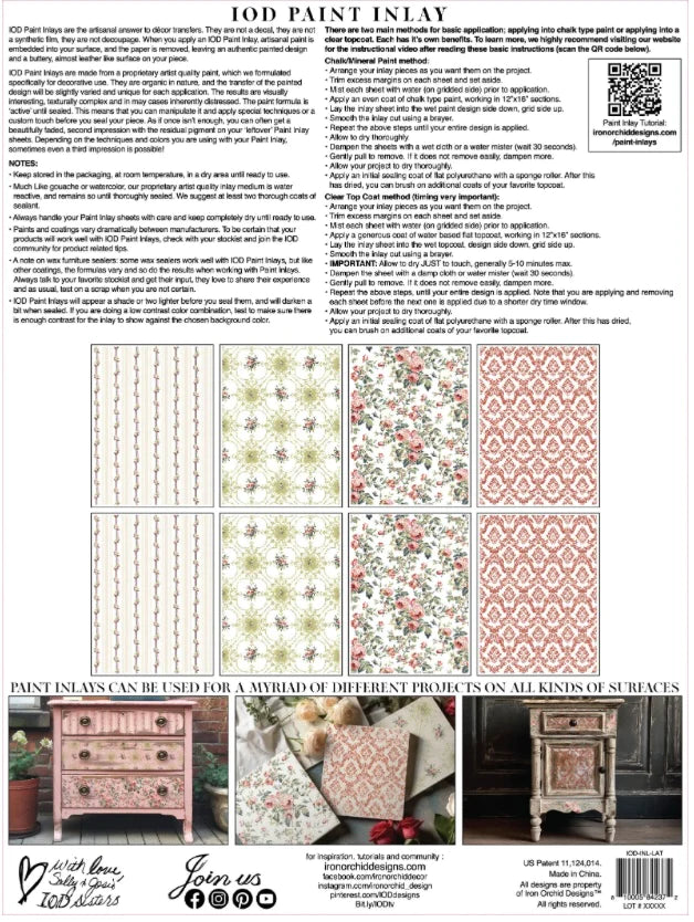 IOD Paint Inlays are the artisanal answer to decor transfers. They are not a decal, they are not a synthetic film, and they are not a decoupage.